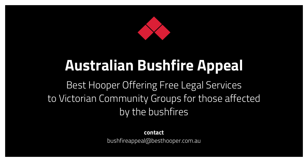 While this new year has sprung upon us in a devastating way, we are always encouraged by the community response and outpour of generosity. The staff at Best Hooper have committed to assisting affected community groups within Victoria by providing legal advice relating to planning and property redevelopment at no cost. It is a small gesture by our team to relieve the pressures on those that need it most. Anyone on behalf of a community group in need of assistance is encouraged to contact us at bushfireappeal@besthooper.com.au.