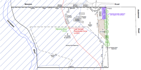 The proposal was to subdivide the subject site into 2 lots. Lot 1 was fully included within the Low Density Residential Zone and the balance was located partly within the Farming Zone (“FZ”) and partly within the LDRZ and contained an existing dwelling. The proposed plan of subdivision submitted with the application is extracted below: